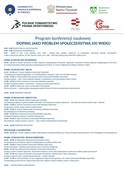 Uniwersyteckie Centrum Badań nad Sportem Uniwersytetu Mikołaja Kopernika w Toruniu, Polskie Towarzystwo Prawa Sportowego i Akademicki Związek Sportowy Organizacja Środowiskowa woj. Kujawsko-Pomorskiego mają zaszczyt zaprosić do udziału w Ogólnopolskiej Konferencji Naukowej poświęconej problematyce dopingu jako zjawiska wykraczającego poza sport profesjonalny.